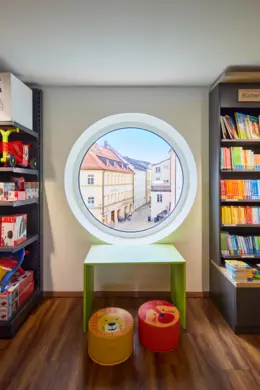 Der Blick aus den beiden runden Fenstern ermöglicht einen bemerkenswert bildhaften Ausblick in die historische Gasse hinter dem Stadtplatz.
